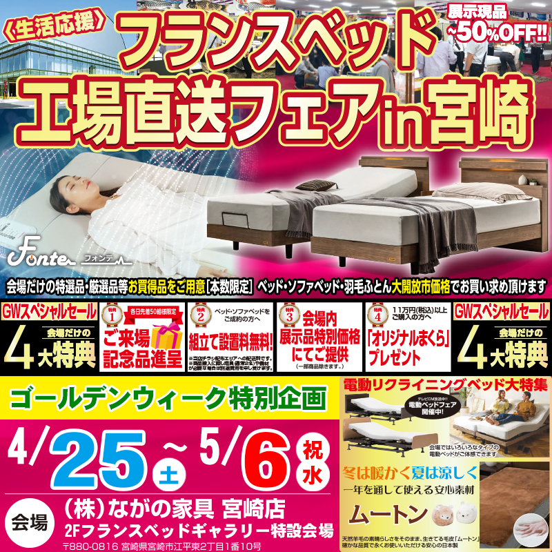 宮崎ながの家具 宮崎店にて、4月25日(土)~5月6日(祝水)の期間限定の特別イベント「フランスベッド 工場直送フェアin宮崎」を開催致します。【フランスベッド 工場直送フェア】数量限定の特別価格商品や展示現品商品、また最新作モデルを多数展示!魅力いっぱいのイベントです。